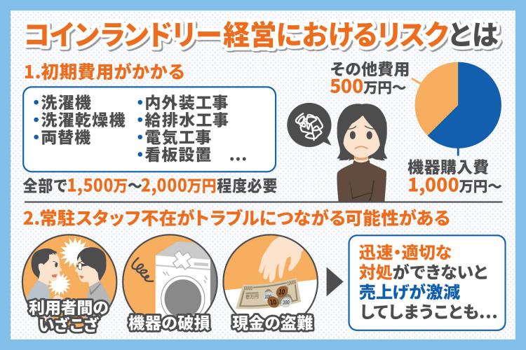コインランドリー経営はアパートやマンション経営より初期負担が少なく、かつ利回りが良いことから高い人気を誇っていますが、一方で投資ならではのリスクがあることも忘れてはいけません。